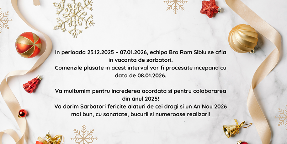 Dragi clienti, toate comenzile plasate in perioada 24.12.2025-07.01.2026 vor fi procesate incepand cu data de 08.01.2026. Va multumim pentru intelegere si va dorim sarbatori linistite! Transport gratuit pentru comenzile de minim 150 de lei!